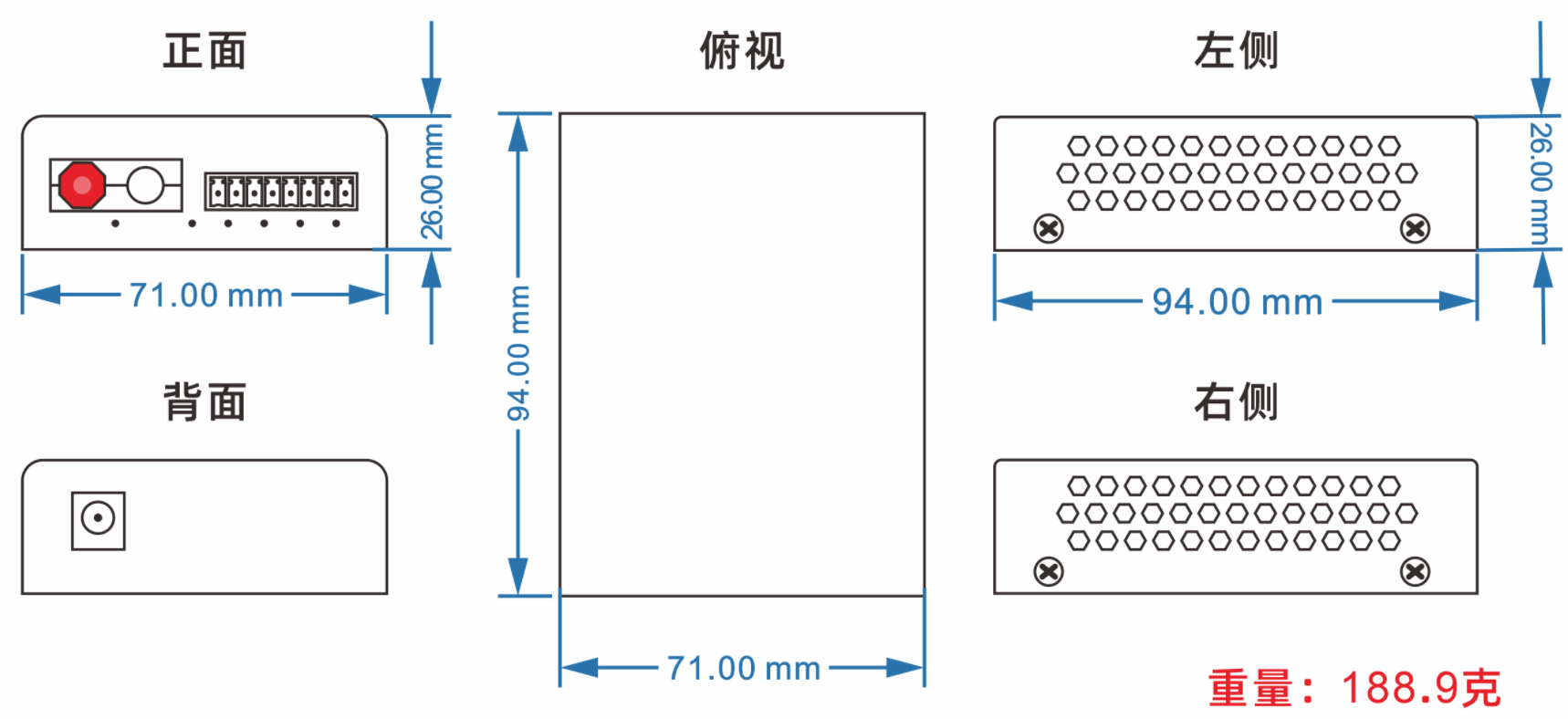 外置電源:94mm(長) x 71mm(寬) x 26mm(高) 內(nèi)置電源:140(長)*110(寬)*30mm(高) |